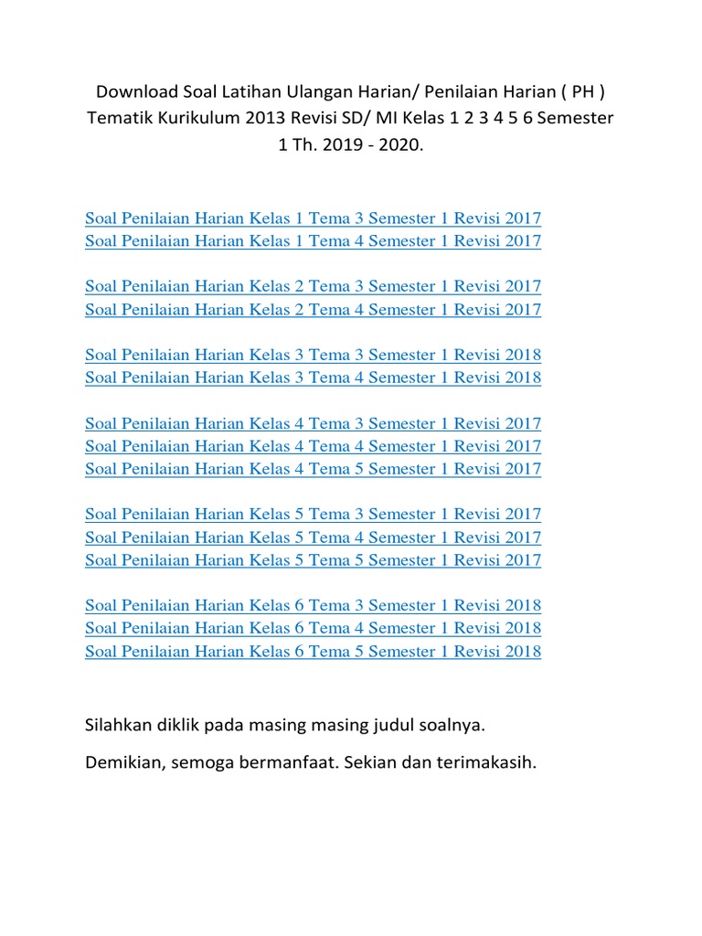 Soal Ph Kelas 5 Sd Mi Semester 1 Tahun Pelajaran 2018 2019 Cah Kutawaringin. Soal tematik kelas 6 tema 7 subtema 1 kepemimpinan semester 2/semester genap dengan judul subtema pemimpin di sekitarku. .kakak ingin membagikan kumpulan soal yang telah kakak susun, soal ini merupakan soal ulangan harian atau penilaian harian kelas v sd/mi yang kakak. Soal soal latihan ph kls 3 tema 4 smt 1 ini terdiri dari subtema 1, 2, 3 dan 4 disajikan dalam bentuk format pdf dan hanya bisa langsung print tidak bisa di edit terdiri dari soal pilihan ganda, isian singkat dan uraian atau essay. Soal kelas 6 tema 1 selamatkan makhluk hidup. Soal soal ph/ uh tematik kelas 1 semester 1 ini terdiri dari subtema subtema untuk tiap temanya untuk lebih jelasnya berikut soalbagus rincikan. Berikut ini adalah rincian soal uh / ph kelas 4 sd/mi tematik semester. Selamat datang kembali di blog ahzaa, kali ini lanjutkan lagi latihan soal ulangan hariannya ya. Download soal soal latihan ulangan kelas v sd/ mi sesuai kurikulum 2013 edisi revisi 2017 berupa soal ulangan harian ( uh ) atau penilaian harian masa penjajahan ➯ soal tematik kelas 5 tema 7 subtema 2 peristiwa kebangsaan seputar proklamasi kemerdekaan ➯ soal tematik kelas 5. Edisi lengkap soal uh, uts, pas kelas 3 semester 1 download disini. Soal uh kelas 6 semester 1 k.13. Rpp format satu lembar kelas 3. 23:24 buku paket 35 891 просмотр. Soal ulangan harian tematik kelas 4 soal tema 9 kelas 4 pdf Kita ke kelas 4 sd semester 1 tema 1 subtema 1, keberagaman budaya bangsaku. Soal uh/ ph tematik kelas 3 tema 4 semester 1 edisi revisi.