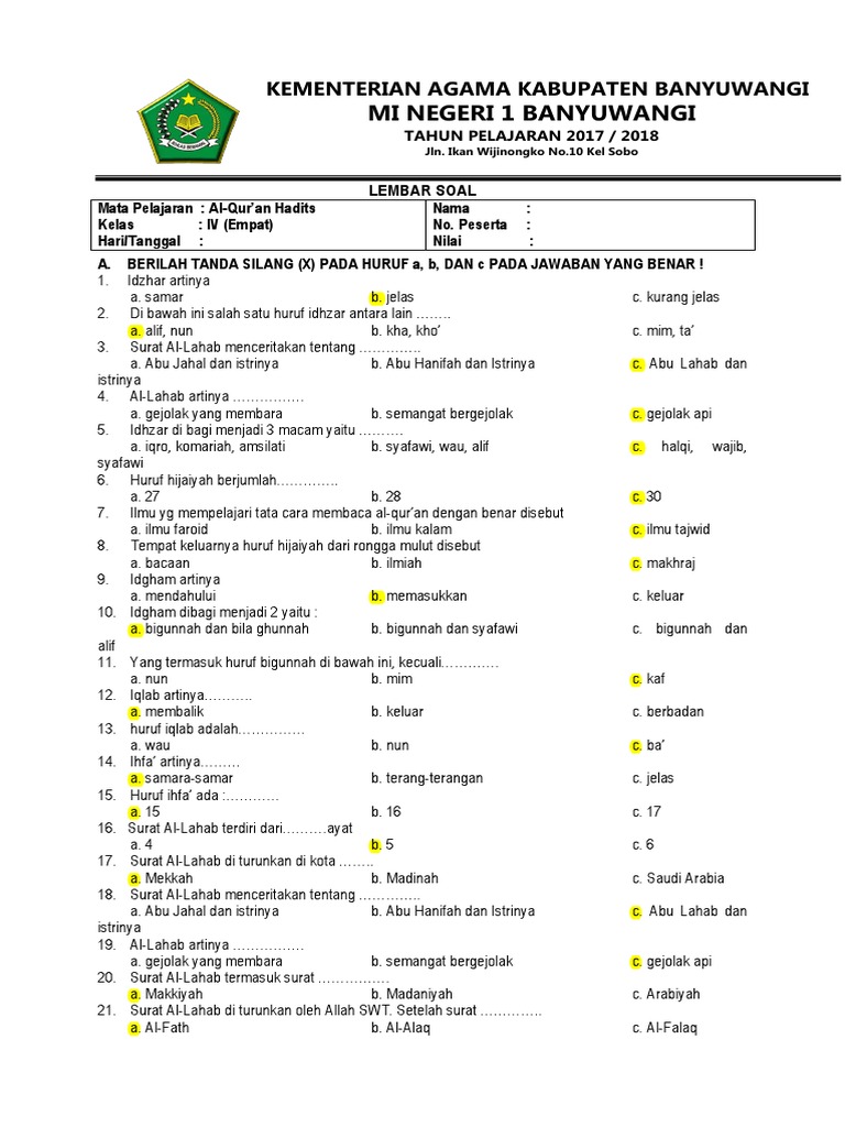 Contoh Soal Uas Ukk Al Qur An Hadits Kelas Vii Mts Terbaru Bacaan Madani Bacaan Islami Dan Bacaan Masyarakat Madani