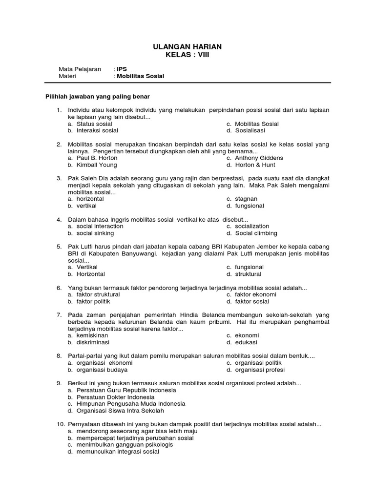 Berikut ini adalah soal sosiologi tentang mobilitas sosial. Sep 08 2020 Contoh soal sistem pencernaan kelas 11 pilgan dan kunci jawaban. Kami akan memberikan Soal IPS Kelas 8 tingkat SMP MTs.