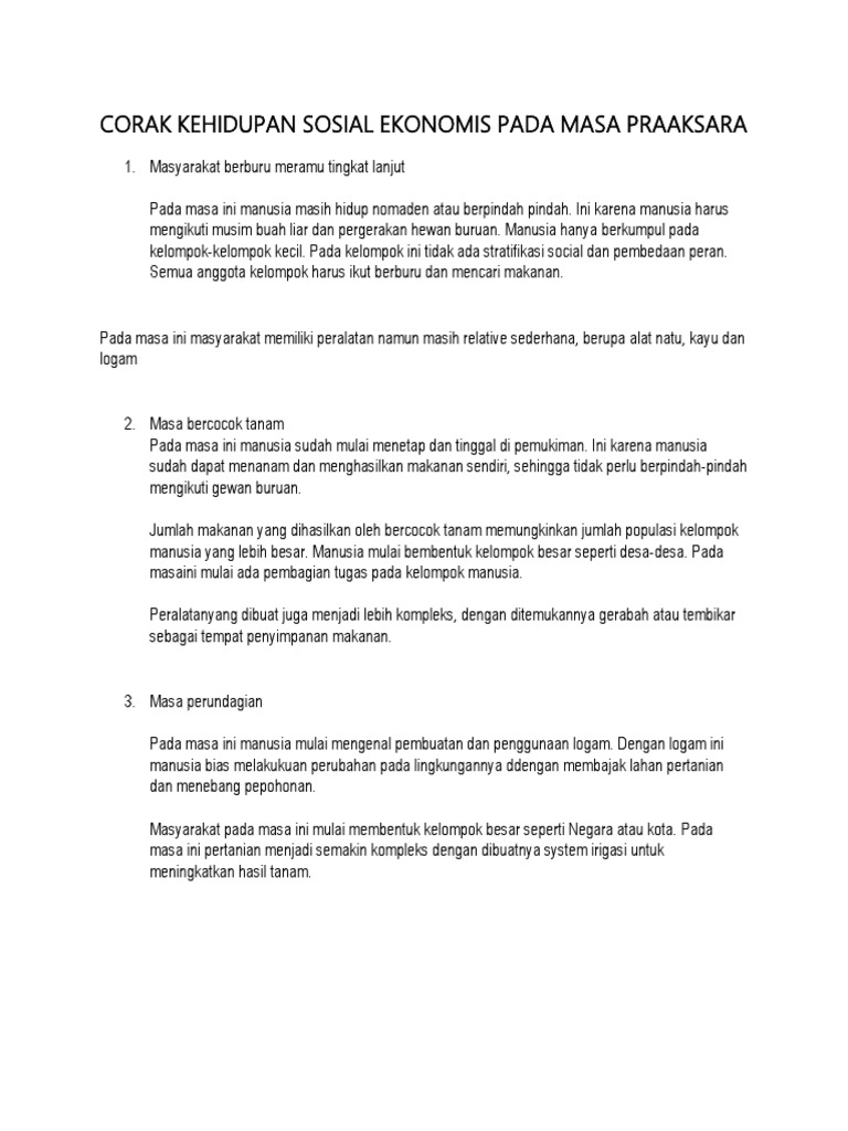 Jelaskan kehidupan masyarakat pada masa praaksara. Secara garis besar kehidupan sosial ekonomi pada masa praaksara dibedakan menjadi dua yaitu Food Gathering masa berburu dan meramu dan Food producing masa bercocok tanam. Pembuatan alat-alat pembuatan bahan logam b. Masa prasejarah atau praaksara merupakan masa kehidupan manusia sebelum mengenal tulisan.