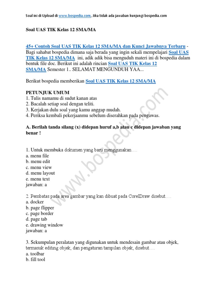 Lengkap 45 Contoh Soal Uas Tik Kelas 12 Sma Ma Dan Kunci Jawabnya Terbaru Bospedia