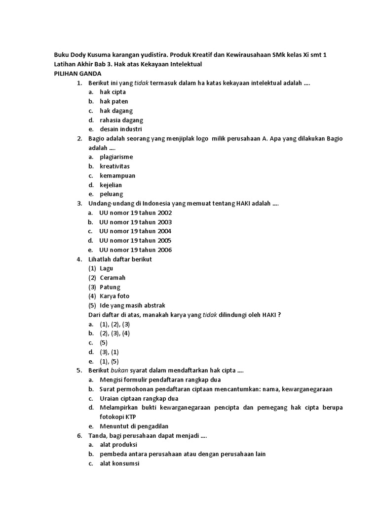Soal Pilihan Ganda Dan Jawaban Produk Kreatif Dan Kewirausahaan Hak Atas Kekayaan Intelektual Ke Dua Imron