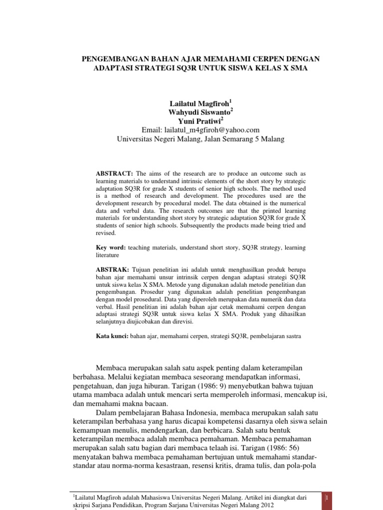 Bahan Ajar Memahami Cerpen Strategi Sq3r Pembelajaran Sastra