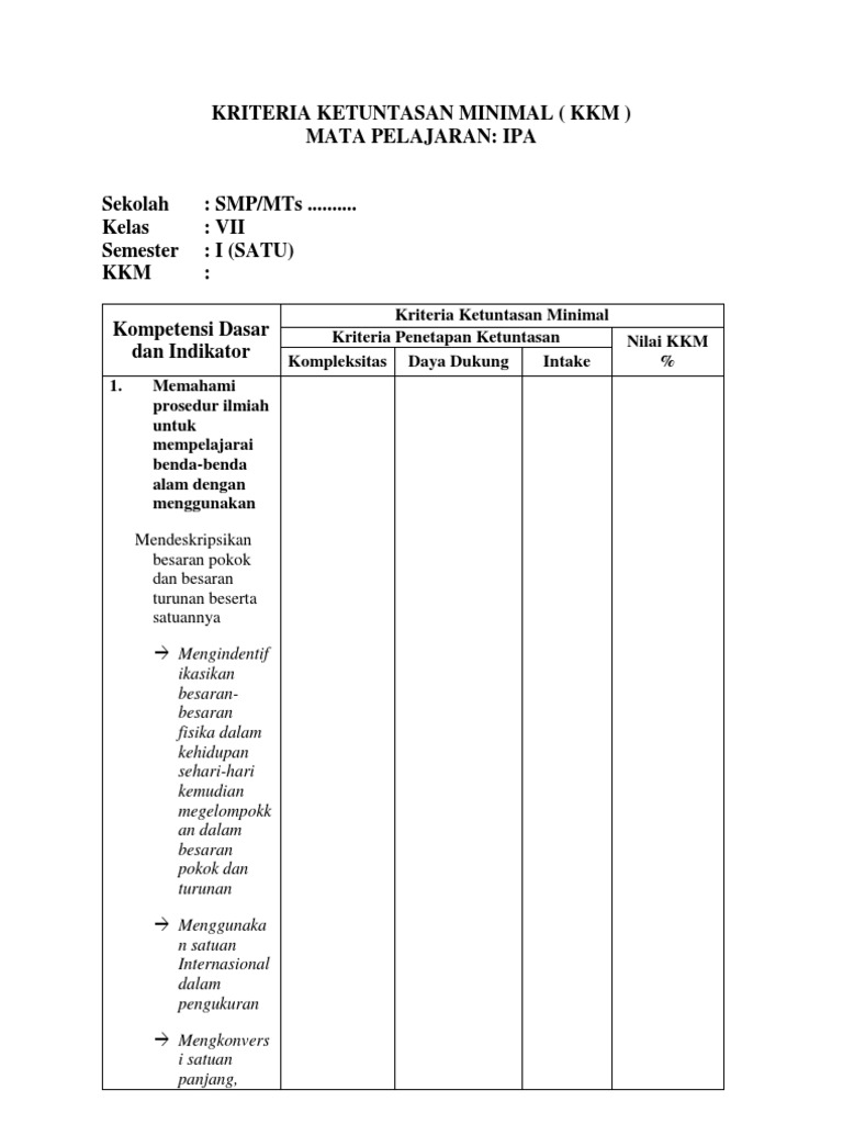 Berikut ini dibagikan format kriteria ketuntasan minimal kkm ipa kelas 7 smp kurikulum 2013.