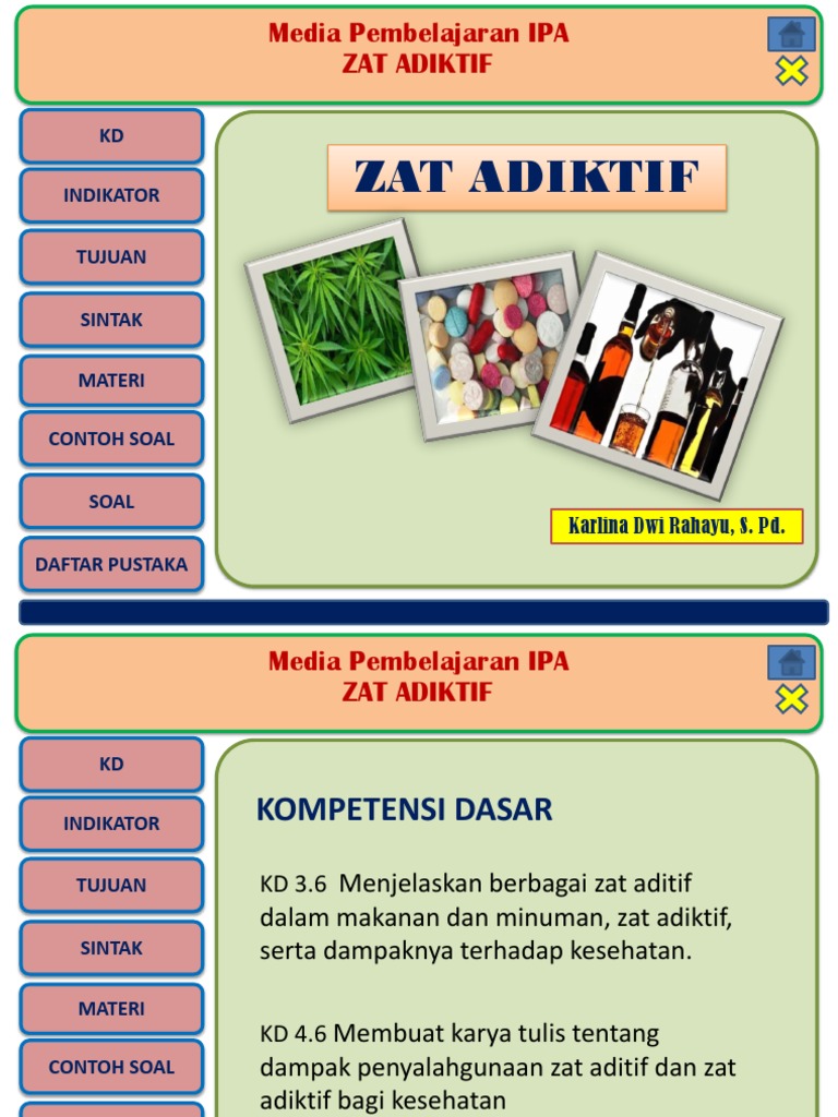 Media ini belum banyak digunakan oleh para pengajar sebagai media pembelajaran. Menganalisis upaya pencegahan penyalahgunaan zat aditif dan psikotropika. Adapun media pembelajaran powerpoint mata pelajaran Ilmu Pengetahuan Alam IPA materi pokok pembelajaran zat aditif adiktif dan psikotropika revisi yang admin bagikan ini secara khusus buat Bapak Ibu Guru yang mengajar IPA di kelas delapan.