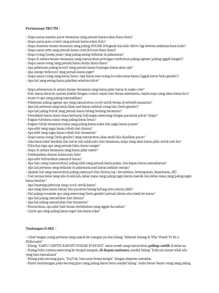 15 Contoh Pertanyaan Truth or Dare biar Chat sama Gebetan. Bebas dari pertanyaan kejujurna yang bisa buat lo mati berdiri. Di tiap nomor kamu sudah isikan pertanyaan yang harus dijawab truth atau tindakan yang mesti dikerjakan dare.