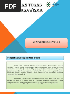 Pada ketentuan 6 Buku wajib boleh ditambahkan buku bantu yang lain sesuai dengan kebutuhan masing-masing tingkatan TP PKK. Kegiatannya diarahkan pada peningkatan kesehatan keluarga. Pengertian dasawisma dasawisma merupakan kelompok ibu ibu yang berasal dari 10 kk rumah yang memiliki tetangga yang tujuannya adalah untuk memudahkan jalannya sebuah program tertentu.