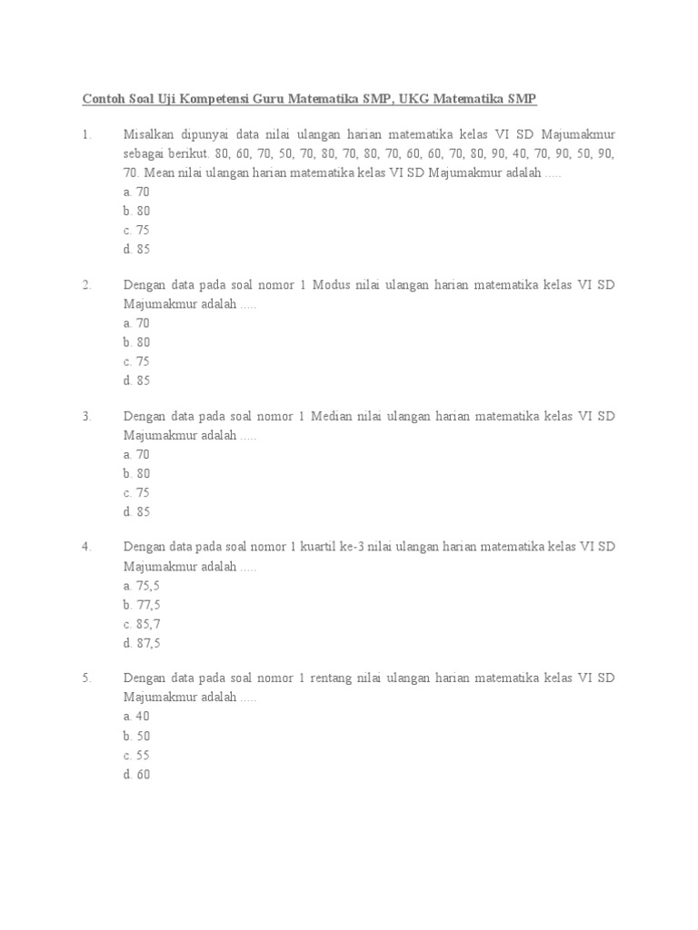 Soal soal pretes matematika smk soal pretes ukg ppg. Berikut ini adalah Kisi Kisi UKG 2015 Terbaru Lengkap dari Kemendikbud yang merupakan kumpulan file dari berbagi sumber Kisi Kisi UKG 2015Uji Kompetensi GuruUKG 2015 tentang contoh soal ukg matematika smp online 2013. Seorang guru yang telah memahami karakteristik peserta didik aspek fisik sosial moral kultural emosional dan intelektual termasuk pemahaman dalam bidang kompetensi.