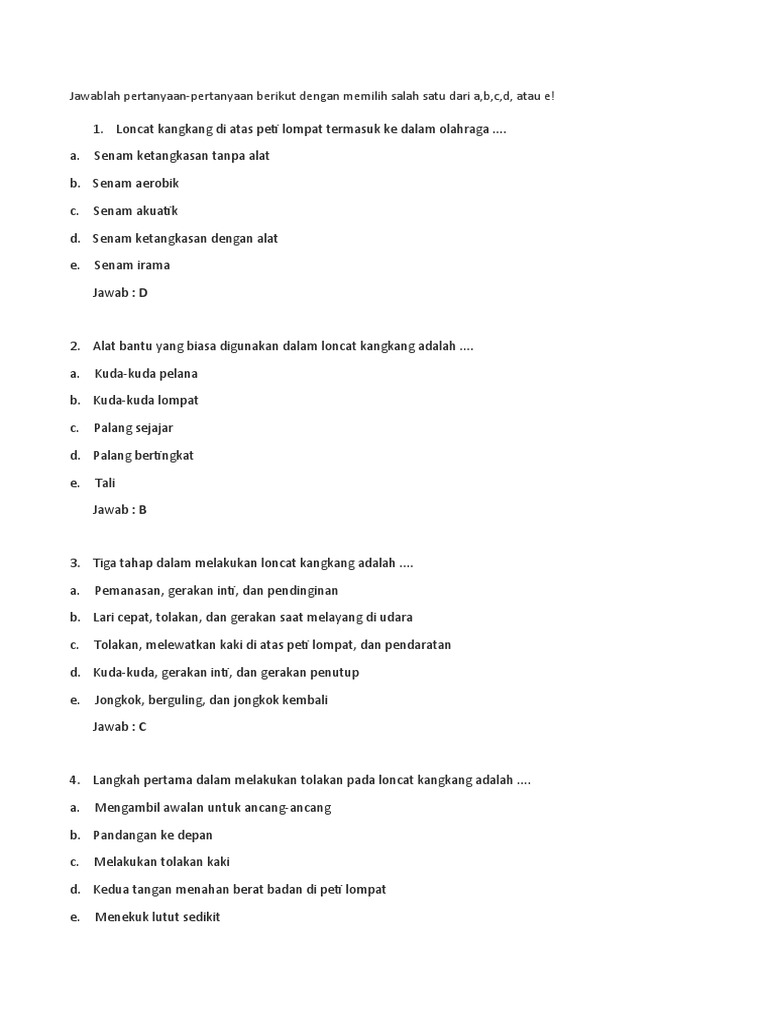 Dimana awalan pada teknik lompat kangkagn tidak terlalu jauh dengan melakukan teknik lompat jauh bedanya adalah jika lompat jauh anda harus melakukan sprint dari awal sedangkan lompat kangkang sprint dilakukan ketika mendekati titik tolakanDan berikut adalah beberapa tahapan dalam melakukan tahapan teknik lompat kangkang. Dalam kejuaraan senam alat yang dimaksud disebut adalah kuda-kuda lompat vaulting horsePelaksanaan gerakan loncat kangkang ini dapat dibagi dalam beberapa tahap yaitu awalan tolakan. Jawablah pertanyaan-pertanyaan berikut dengan memilih salah satu dari abcd atau e.