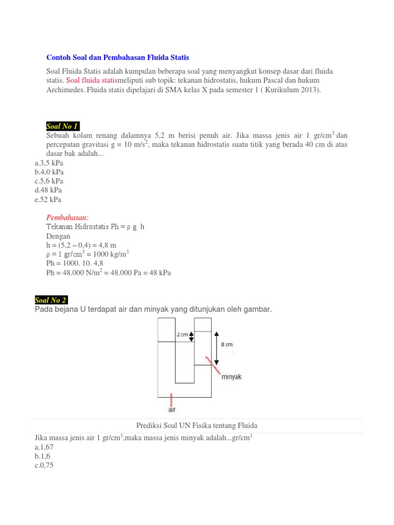 S oal Flu ida Statis dan Pembahasan Contoh S oal dan Pembahasan Fluida Statis Soal Fluida Statis adalah kumpulan beberapa soal yang menyangkut konsep dasar dari fluida statis. Fluida dianggap tidak kompresibel. Contoh soal tekanan hidrostatis dan contoh soal tentang gaya Archimedes contoh soal tentang hukum Pascal yang disajikan dalam beberapa jenis soal seperti grafik soal.