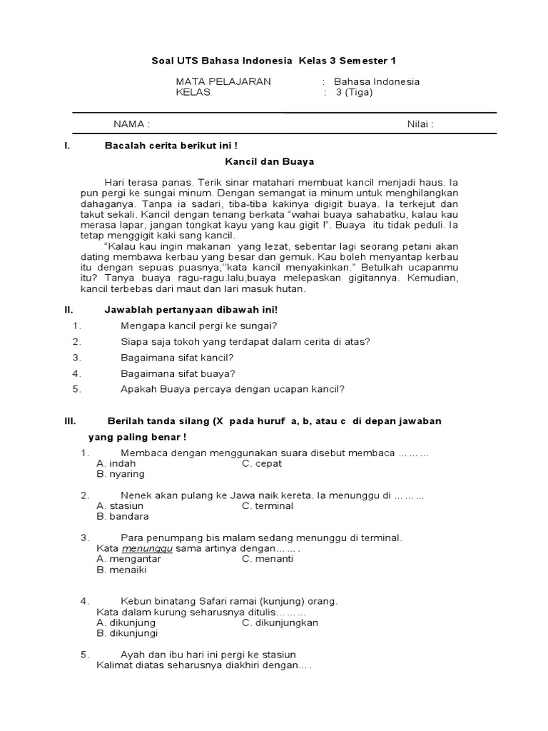 Soal Uts Bahasa Indonesia Kelas 3 Semester 1