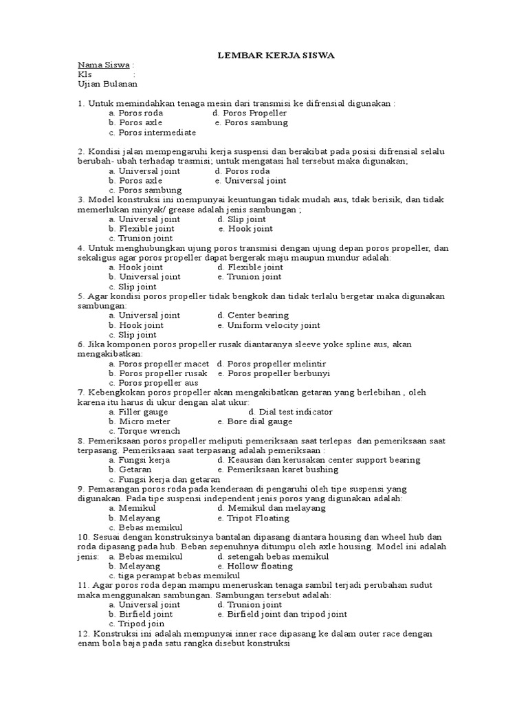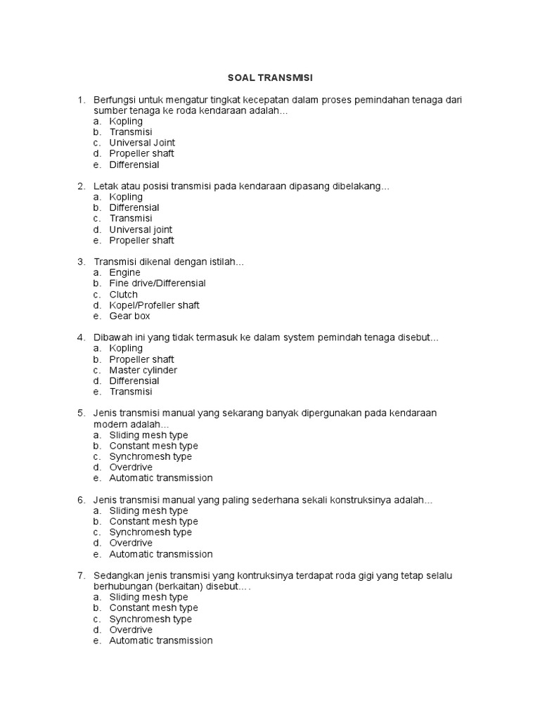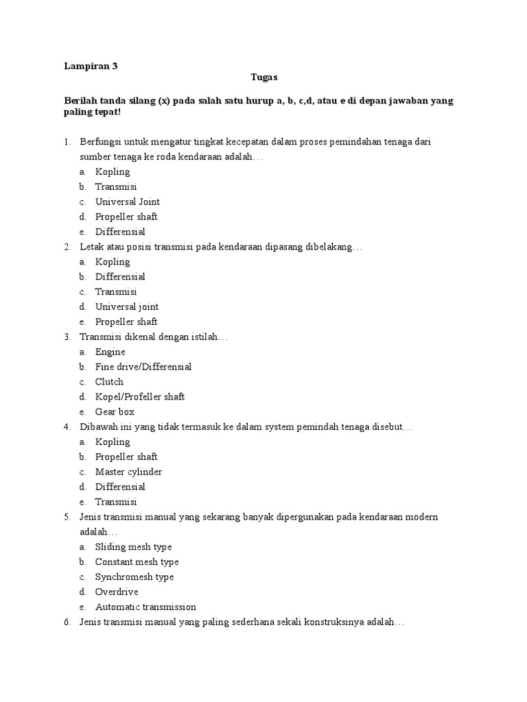 Soal Transmisi Dan Kunci Jawaban - Guru Galeri 5 Ags 2020. Sebagai penerus putaran dari engine ke transmisi secara langsung. Berilah tanda silang x pada salah satu hurup a b cd atau e di depan jawaban yang paling tepat.