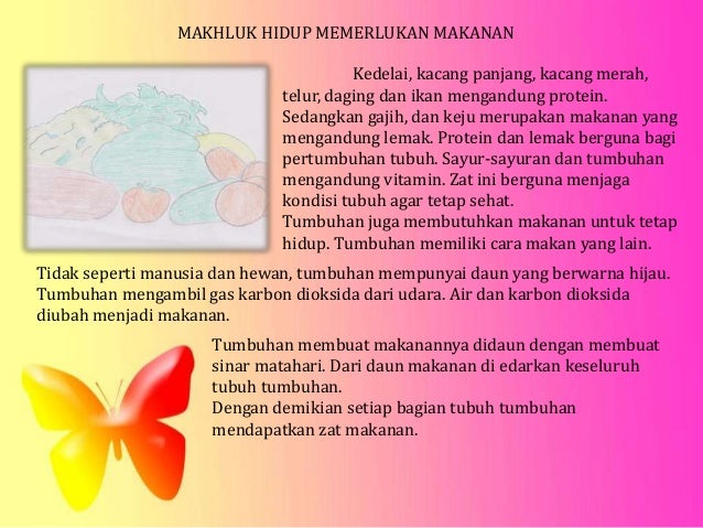 Amatilah makhluk hidup dan benda tidak hidup. Semua makhluk hidup membutuhkan makanan. Batu kerikil air dan udara adalah benda tidak hidup.