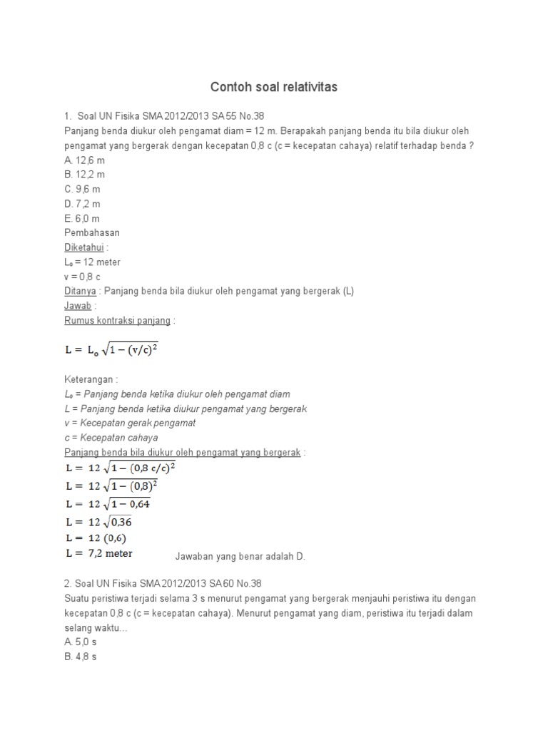Page 2 of 26. Dalam membantu mutu pendidikan di Indonesia kami selalu berkontribusi agar dapat siswa belajar dan paham hitungan soal terkait materi dari Teori Relativitas Relativistik. 942020 Contoh soal relativitas beserta jawabanDi bawah ini adalah contoh soal structure and written expression.