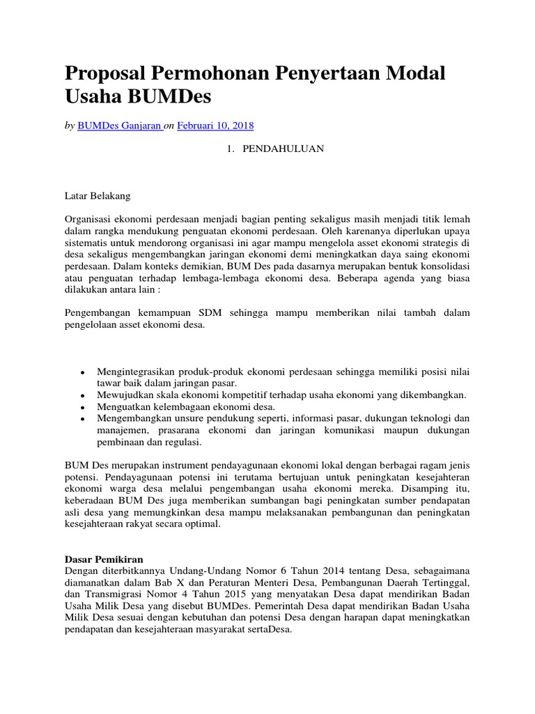 Proposal penambahan penyertaan modal bumdes mitra braja tahun 2021 desa malausma kecamatan malausma kabupaten majalengka provinsi jawa barat 45464 daftar isi surat. Dengan adanya Proposal Usaha ini tidak akan tertinggal informasi mengenai apa itu bisnis usaha roti bakar yang bernama Bimby RoKar Cafe Penulis menyadari bahwa dalam penyusunan Proposal Usaha ini masih banyak terdapat kekurangan dan kesalahan. Jumlah penduduk yang terus bertambah perekonomian yang semakin sulit dan lapangan kerja yang peluangnya semakin sedikit membuat penduduk semakin banyak yang menganggur.