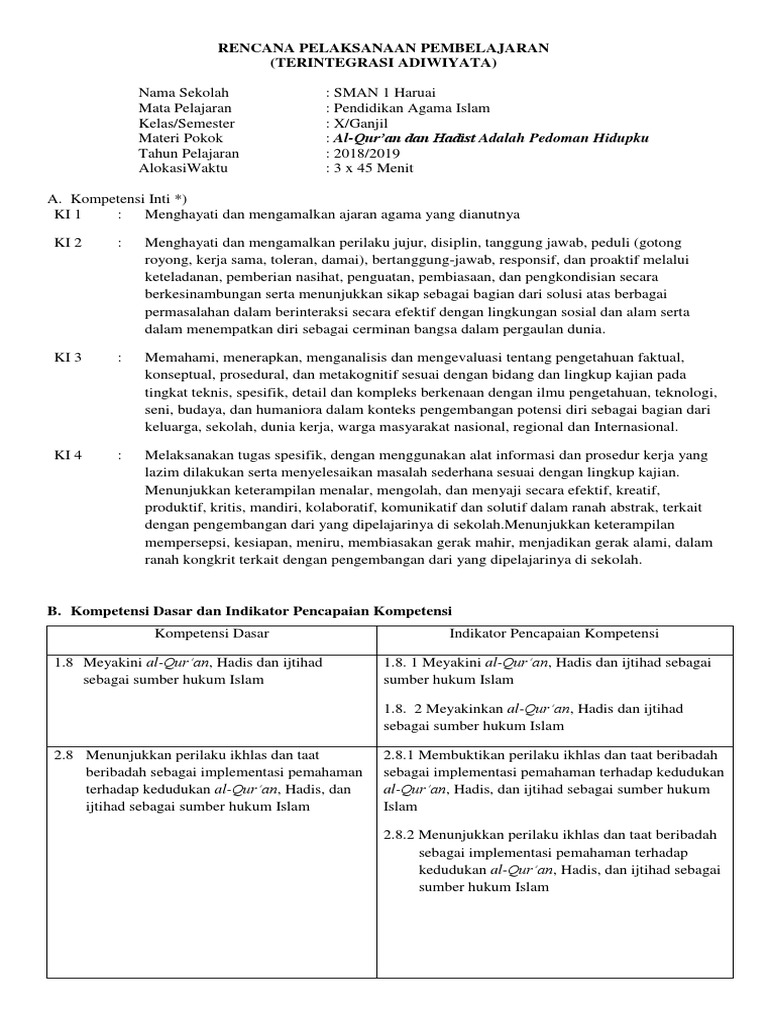 Rpp Pai Kelas X Terintegrasi Adiwiyata 2019