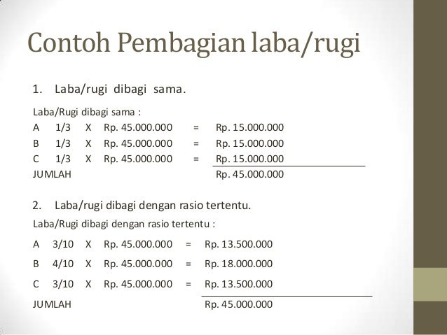 Pembagian laba dan rugi persekutuan perubahan kepemilikan firma bahkan pembubaran persekutuan menjadi materi akuntansi keuangan lanjutan 1. Abadi Sentosa memiliki neraca dan laporan laba rugi sebagai berikut. Pengertian firma menurut para ahli adalah akad kerjasama untuk menjalankan kegiatan operasional sesuai dengan akta pendirian yang disepakati.