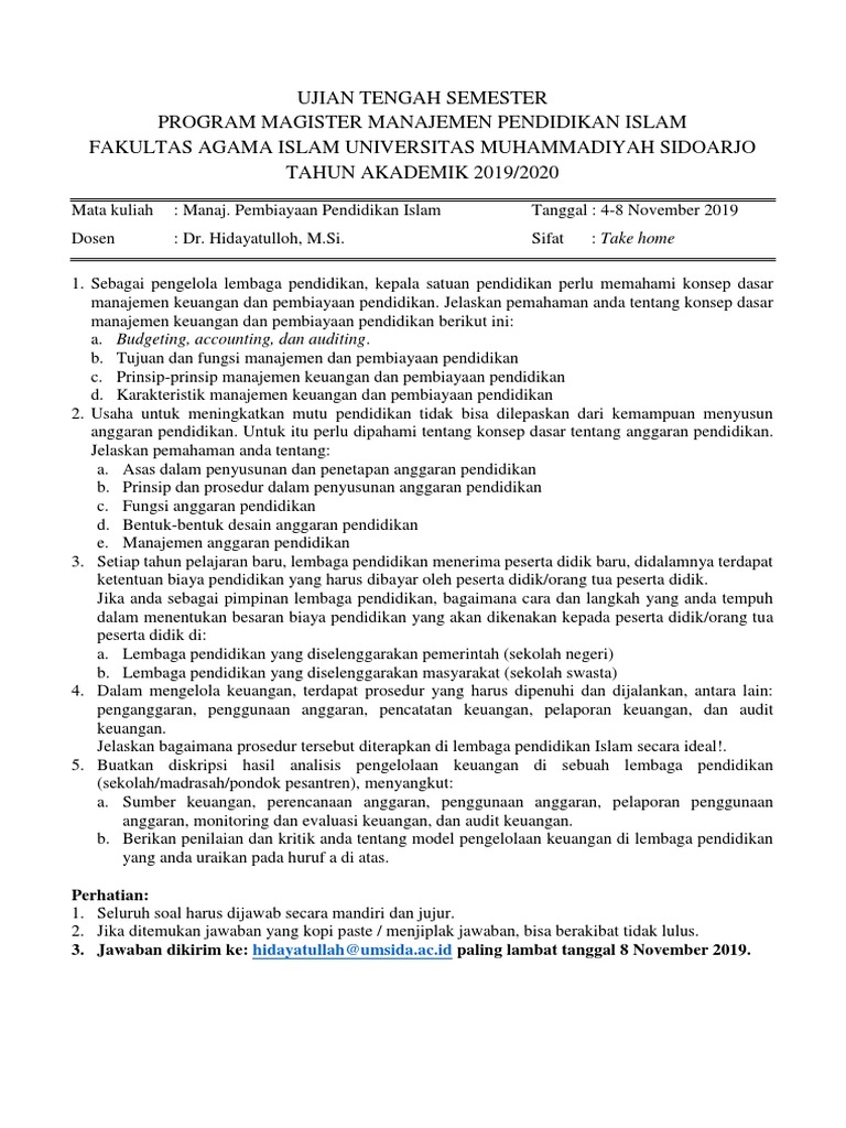 Soal Uts Manajemen Pembiayaan Pendidikan 2019 Docx