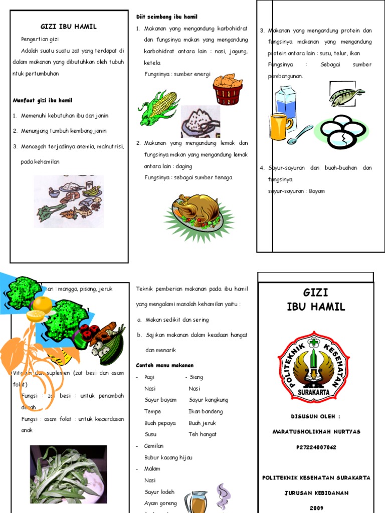 Contoh isi leaflet gizi ibu hamil gizi ibu hamil adalah semua makanan yang bergizi yang dikonsumsi oleh ibu yang digunakan untuk aktivitas dalam tubuh dan asupan nutrisi bagi janin yang dikandung. Makanan yang harus dihindari. 1 piring nasi atau penggantinya 1 gelas 1 butir telur ceplok.