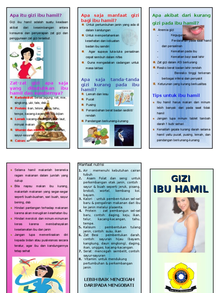Contoh leaflet gizi pada ibu hamil. Manfaat gizi bagi ibu hamil c. ANEMIA PADA IBU HAMIL A. Terhadap JaninKekurangan gizi pada ibu hamil dapat mempengaruhi pertumbuhan janin dan dapat menimbulkan keguguran abortus bayi lahir mati kematian neonatal cacat bawaan anemia pada bayi asfiksia intra partum mati dalam kandungan dan.