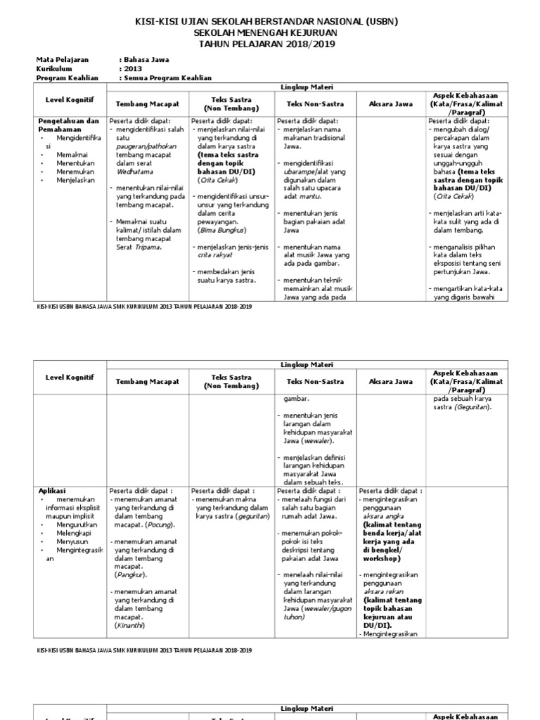 KISI-KISI PENULISAN SOAL USBN Jenjang Pendidikan. Jadi mata pelajaran ini tidak diterapkan pada seluruh sekolah yang ada di Indonesia melainkan cuma pada daerah tertentu saja contohnya. Download Perangkat Pembelajaran K13 Bahasa Jawa Smp Kelas 9 Mr.
