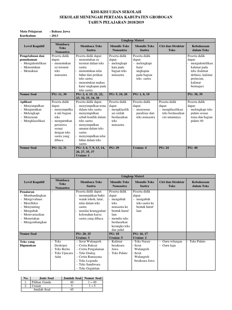 KISI-KISI UJIAN SEKOLAH BAHASA JAWA SMP TP 2020-2021. Anaksmp-mts berjumpa kembali dengan kami pada kesempatan ini akan mambahasa tentang Kisi-kisi PAT MULOK BAHASA JAWA KELAS 8 SMP MTs TAHUN 20192020 seperti yang kita tahu mata pelajaran bahasa jawa merupakan salah satu mapel mulok yang artinya mata pelajaran itu merupakan kebudayaan dari suatu daerah. Poin 1 - 4 mengidentifikasi karakteristik crita cekak.