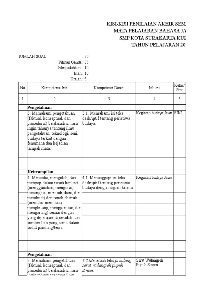 Kumpulan Soal Uas Kelas 7 8 9 Semester 2 Lengkap Semua Pelajaran. Kisi kisi bahasa jawa smp Menjelaskan makna salah satu tradisi lisan Jawa yang dapat membentuk karakter siswa. Berikut ini bentuk kisi-kisi PAS mata pelajaran Bahasa Jawa untuk kelas 8 SMP pada tahun pelajaran 2020-2021.