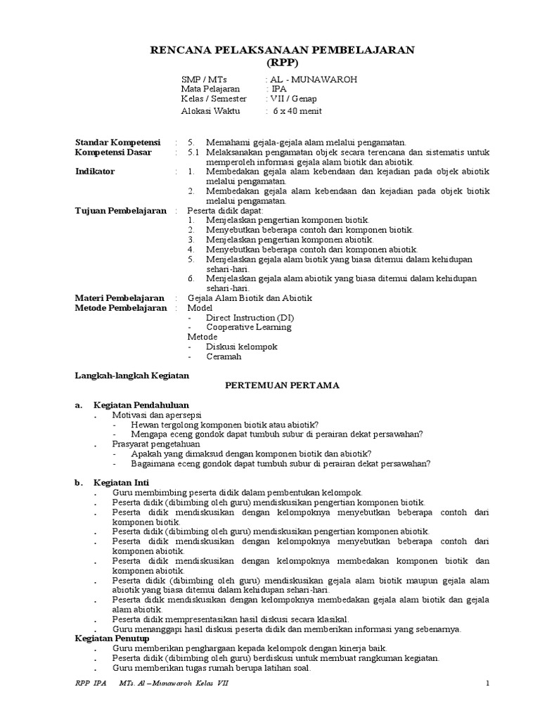 RPP IPA Kurikulum 2013 Kelas 7 VII Semester 1 Ke-2docx. RPP berisi tiga komponen yaitu tujuan pembelajaran kegiatan pembelajaran dan penilaian. Download RPP IPA SMP Kelas 7 Kurikulum 2013 Revisi 2017.